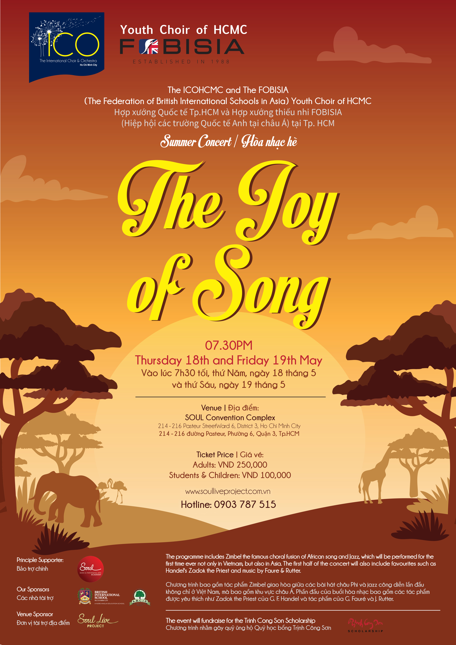 Our next concert, The Joy of Song, will take place on the 18th and 19th of May 2017. The concert includes Zimbe! the famous choral fusion of African song and jazz, which will be performed for the first time in Asia. The first half of the concert will see the International Choir and Orchestra of HCMC perform Handel’s Zadok the Priest, as well as works by Gabriel Faure & John Rutter.